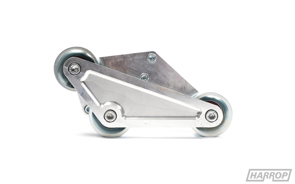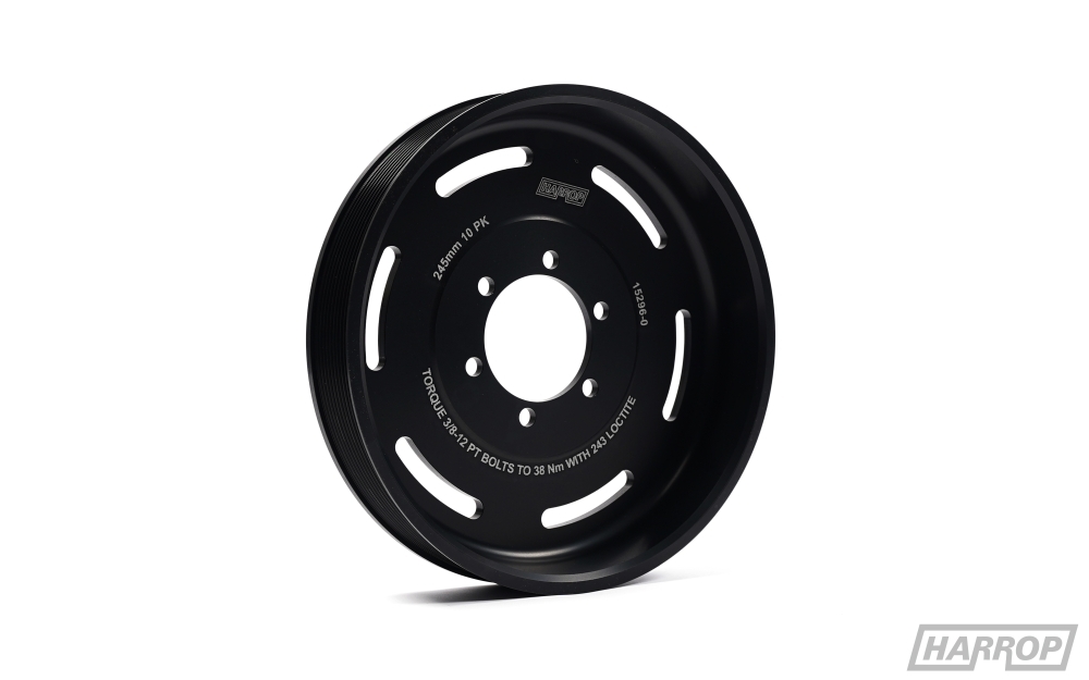 Due to the limited belt lengths available our upgraded 10PK drive system must use the newly designed Harrop tensioner manufactured from billet 6061 aluminium. The Harrop LSA style Tensioner has 10deg more radial travel than the OEM tensioner providing more flexibility with belt lengths and is also fitted with a heavier spring providing up to 40% greater load at full travel. The new Harrop LSA style Tensioner is ideal for our 10PK and 12PK FEAD systems minimising belt slip but can still be used with the OEM 8PK system.