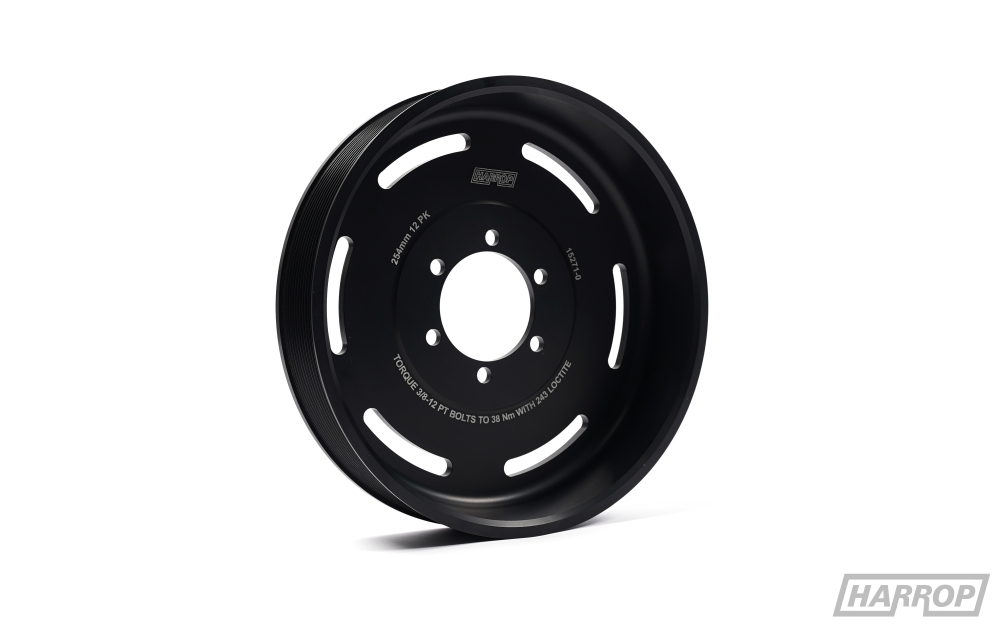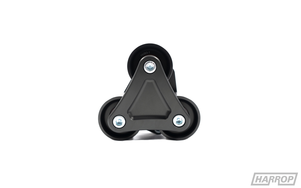 Due to the limited belt lengths available the upgraded 12PK drive system must use the newly designed Harrop tensioner manufactured from billet 6061 aluminium. The Harrop LSA style Tensioner has 10deg more radial travel than the OEM tensioner providing more flexibility with belt lengths and is also fitted with a heavier spring providing up to a 40% greater load at full travel. The new Harrop LSA style Tensioner is ideal for our 10PK and 12PK FEAD systems minimising belt slip but can still be used with the OEM 8PK system.